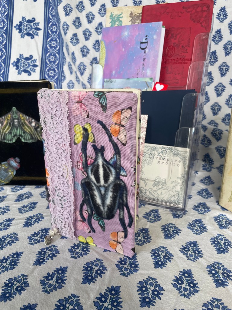 Close up of ‘Carmilla’ by Sheridan Le Fanu (fabric on the cover from a old shirt and a bug cut from another fabric)