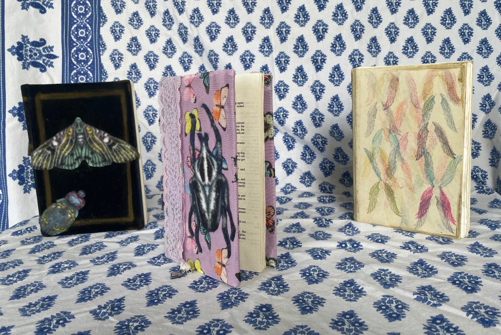 three hand-sewn hard cover books, From left to right: Velvet + Fabric bugs special bound copy of ‘An education in Malice’, Special bound copy of ‘Carmilla’, A hardcover sketch book with a variety of pages