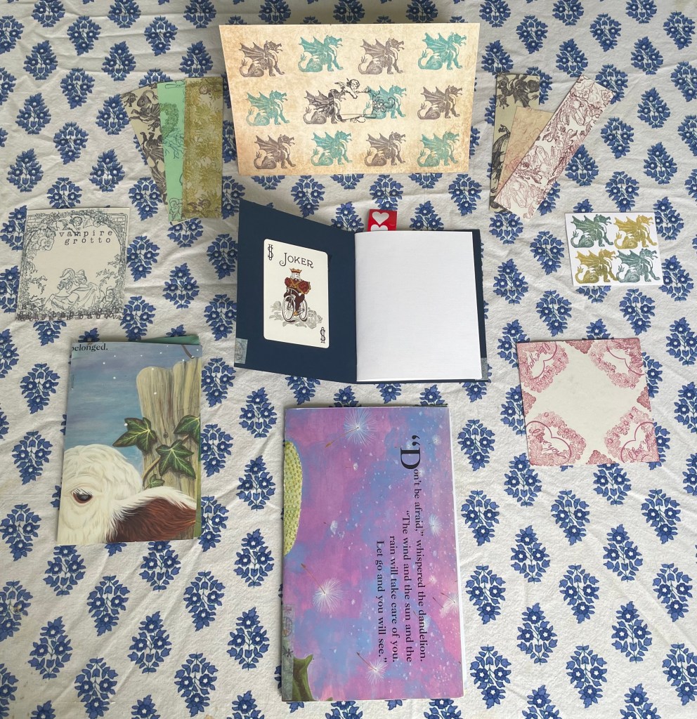 Close up of some stationary, bookmarks, and small little paper notebooks