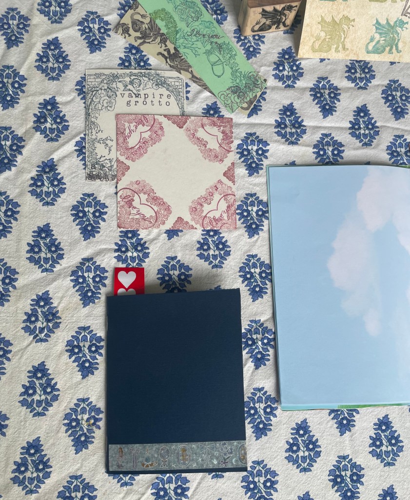 Close up of some stationary, bookmarks, and small little paper notebooks, this time featuring a cloud page