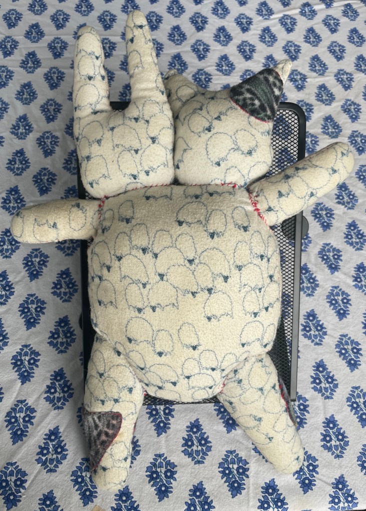 A two stuffed animal made from a baby blanket and sewn by hand, with extra bugs sewn on top