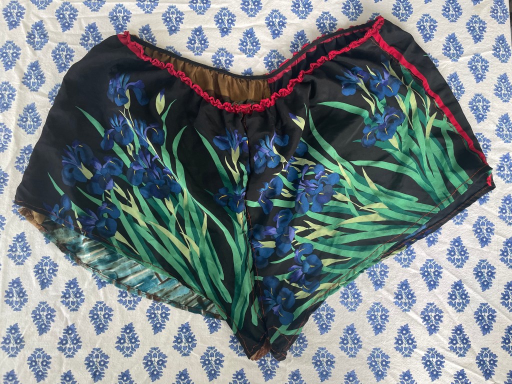 Silk shorts handsewn with silk thread, made from two different scarves and a piece of elastic